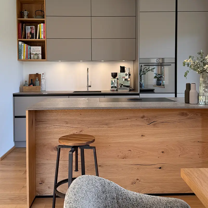 In unserem Küchenstudio in Übersee am Chiemsee planen wir jede beige Küche individuell und millimetergenau. Dank unserer Schreinerei im Hintergrund sind auch besondere Anforderungen oder komplexe Grundrisse problemlos umsetzbar.