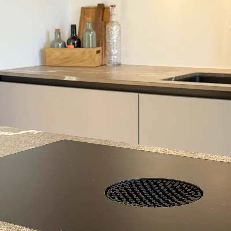 Das matte Bora XPURE Kochfeld fügt sich nahtlos in die Naturstein-Arbeitsplatte ein und unterstützt das reduzierte Design der grauen Küche. Der V-ZUG Dampfbackofen eröffnet vielseitige Möglichkeiten für gesundes und präzises Kochen, während Siemens Geräte für Effizienz und Zuverlässigkeit stehen.