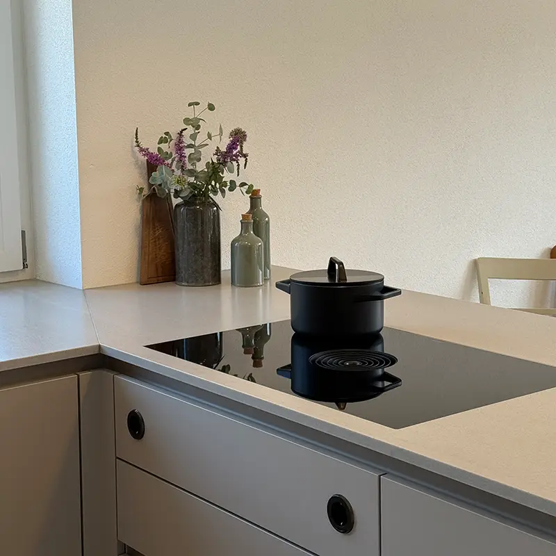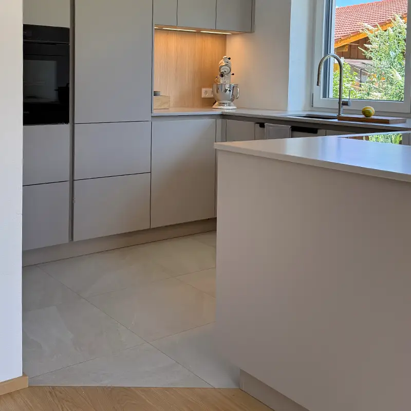 Ob für ambitionierte Hobbyköche oder für Familien, die viel Wert auf ein harmonisches Zuhause legen – diese Küche passt sich jedem Lebensstil an. Mit Fronten in Sandgrau, einer Naturstein-Arbeitsplatte und Akzenten in Eiche entsteht ein zeitloses Konzept, das lange Freude bereitet.