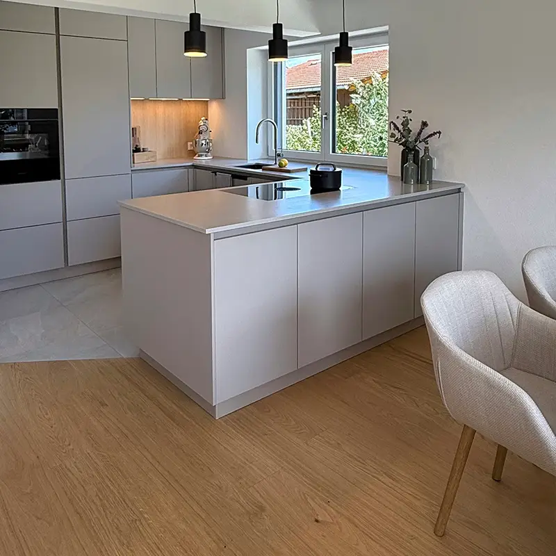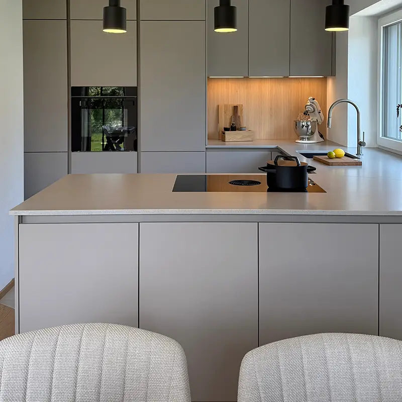 Die Wahl der Materialien ist entscheidend für die Wirkung einer Küche. Hier überzeugt die graue Küche mit Fronten in Sandgrau, die dem Raum eine warme, elegante Note verleihen. Sie wirken edel, zurückhaltend und lassen sich hervorragend mit hellen oder dunklen Akzenten kombinieren.
